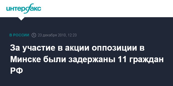 Минск. 23 декабря. INTERFAX.RU - Правоохранительными органами Белоруссии за участие в несанкционированной акции в Минске были задержаны 11 граждан Российской Федерации.