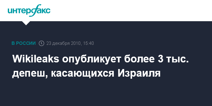 Дубай. 23 декабря. INTERFAX.RU - Веб-сайт Wikileaks опубликует тысячи документов, касающихся Израиля в ближайшие полгода, сообщил основатель Wikileaks Джулиан Ассандж в интервью вещающему из Катара межарабскому телеканалу Al-Jazeera.