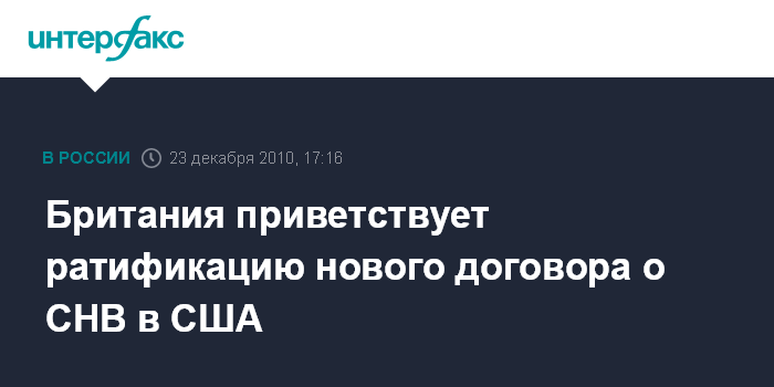 Лондон. 23 декабря. INTERFAX.RU - Министр иностранных дел Великобритании Уильям Хейг удовлетворен ратификацией нового договора о стратегических наступательных вооружениях (СНВ) сенатом США, сообщило в четверг агентство ЭФЭ.
