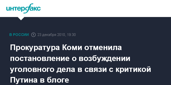 Москва. 23 декабря. INTERFAX.RU - Прокуратура Коми отменила постановление о возбуждении уголовного дела по статье "об оскорблении представителя власти" в связи с критикой главы правительства РФ Владимира Путина в "Живом журнале", сообщили в Генпрокуратуре РФ.