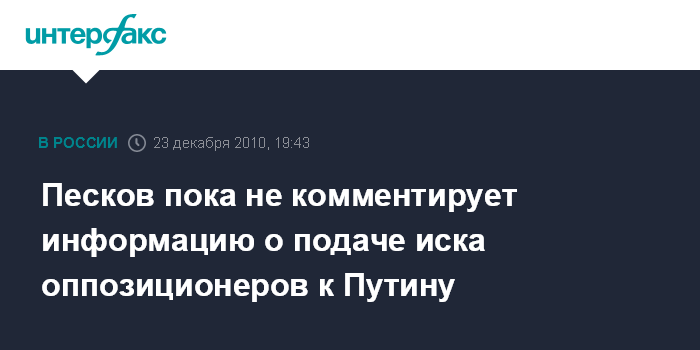 Нижний Новгород. 23 декабря. INTERFAX.RU - Пресс-секретарь премьер-министра РФ Дмитрий Песков пока воздержался от комментариев в связи с появившейся информацией об иске к Владимиру Путину в размере 1 млн рублей, поданном представителями оппозиции.