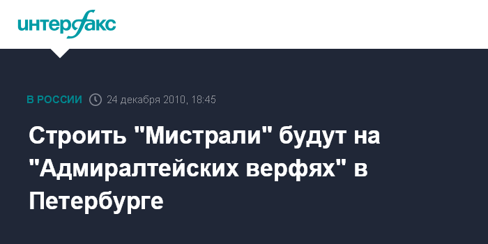 Москва. 24 декабря. INTERFAX.RU - Десантные вертолетоносные корабли "Мистраль" на территории России будут строиться на "Адмиралтейских верфях" в Санкт-Петербурге, сообщил "Интерфаксу-АВН" в пятницу пресс-секретарь Объединенной судостроительной корпорации Игорь Рябов.
