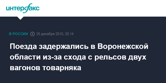 Москва. 25 декабря. ИНТЕРФАКС - В Воронежской области сошли с рельсов два грузовых вагона, что привело к задержкам в движении поездов.