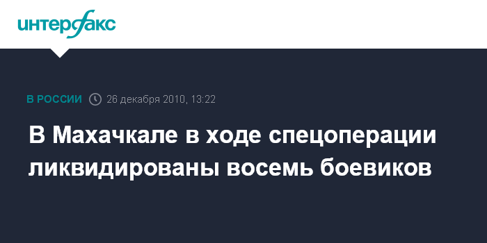 Ростов-на-Дону. 26 декабря. INTERFAX.RU - Восемь боевиков уничтожены в ходе спецоперации, завершившейся в воскресенье в Махачкале, сообщил "Интерфаксу" источник в правоохранительных органах Дагестана.