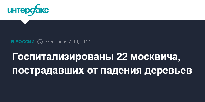 Москва. 27 декабря. INTERFAX.RU - В результате падения деревьев и обледеневших массивных ветвей в Москве за минувшие сутки пострадали 27 человек, сообщил "Интерфаксу" в понедельник источник в медицинских кругах.