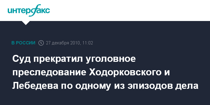 Москва. 27 декабря. INTERFAX.RU - Хамовнический суд Москвы прекратил уголовное преследование экс-главы НК "ЮКОС" Михаила Ходорковского и бывшего руководителя МФО "МЕНАТЕП" Платона Лебедева по эпизоду, связанного с хищением акций "Томскнефть-ВМК".