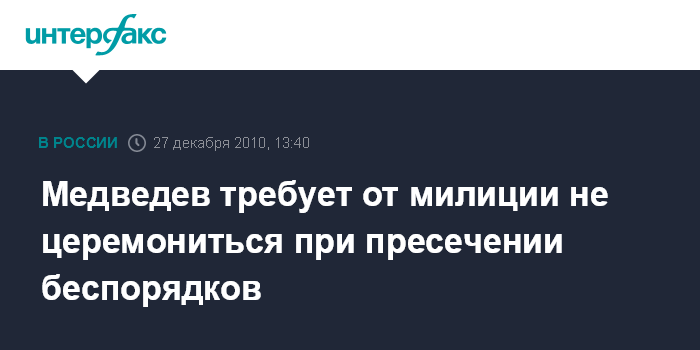 Москва. 27 декабря. INTERFAX.RU - Президент РФ Дмитрий Медведев призвал правоохранительные органы незамедлительно пресекать любые попытки разжигания межнациональной розни и массовых беспорядков.