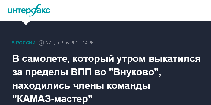 Москва. 27 декабря. INTERFAX.RU – В самолете, который выехал при посадке в столичном аэропорту "Внуково" выехал за пределы ВВП, находились члены команды "КАМАЗ-мастер" (Набережные Челны, Татарстан), сообщил пилот команды Владимир Чагин на пресс-конференции в центральном офисе "Интерфакса" в понедельник.