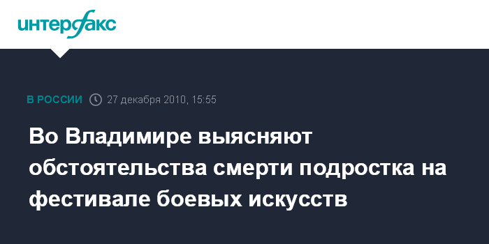 Владимир. 27 декабря. INTERFAX.RU - На фестивале боевых искусств, проходившем во Владимирском городском центре здоровья в воскресенье, скончался один из его участников - 13-летний подросток.