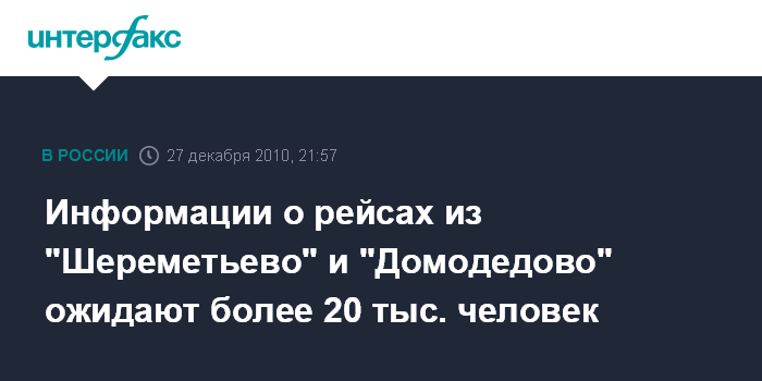 Москва. 27 декабря. ИНТЕРФАКС - По информации Ассоциации туроператоров России (АТОР), более 20 тысяч человек ждут сведений о времени вылета самолетов из аэропортов "Шереметьево" и "Домодедово".