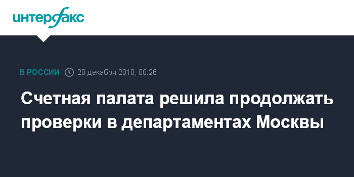 Москва. 28 декабря. INTERFAX.RU - Счетная палата РФ планирует продлить проверки московского метрополитена, Мосгортранса, Мосэнерго и финансирования строительства дорог.