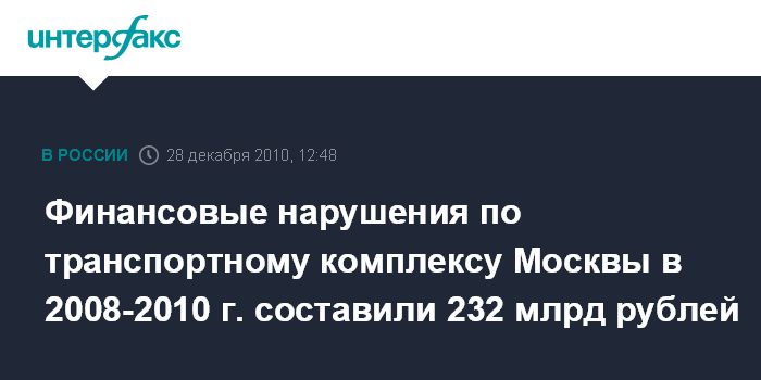 Финансовые нарушения по транспортному комплексу Москвы в 2008-2010 г. составили 232 млрд рублей