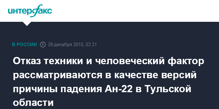 Москва. 29 декабря. ИНТЕРФАКС-АВН - Минобороны РФ рассматривает две версии катастрофы Ан-22 - отказ техники и человеческий фактор, заявил "Интерфаксу" в среду источник в ВВС России.