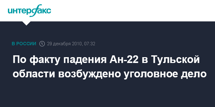 Москва. 29 декабря. ИНТЕРФАКС - Уголовное дело возбуждено по факту падения военно-транспортного самолета Ан-22 в Тульской области, сообщила "Интерфаксу" в среду помощник военного прокурора Московского военного округа Наталия Земскова.