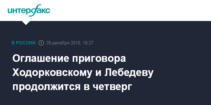 Москва. 29 декабря. INTERFAX.RU - Хамовнический суд Москвы в четверг продолжит оглашение приговора по второму уголовному делу против экс-главы НК "ЮКОС" Михаила Ходорковского и бывшего руководителя МФО "МЕНАТЕП" Платона Лебедева.