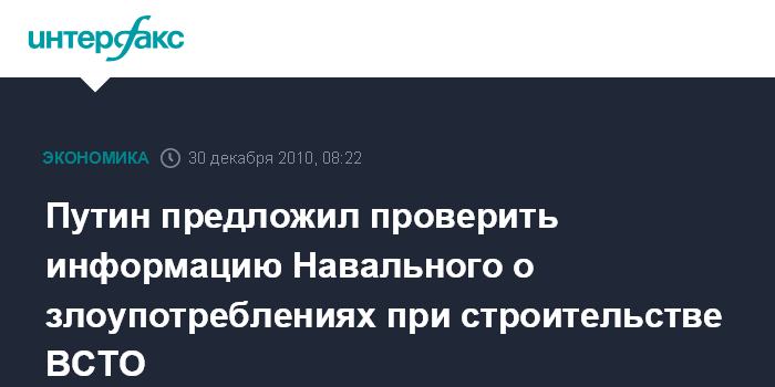Москва. 30 декабря. INTERFAX.RU - Премьер РФ Владимир Путин считает, что информация блоггера Алексея Навального, являющегося миноритарием "Транснефти", о злоупотреблениях при строительстве ВСТО заслуживает проверки.