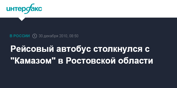 Сообщение об аварии поступило в 08:19 мск. Рейсовый автобус следовал из Москвы во Владикавказ, и на 947-м км трассы М-4 "Дон" столкнулся с грузовой фурой, предположительно, "КамАзом", сообщили агентству "Интерфакс" в пресс-службе департамента по предупреждению и ликвидации ЧС Ростовской области.