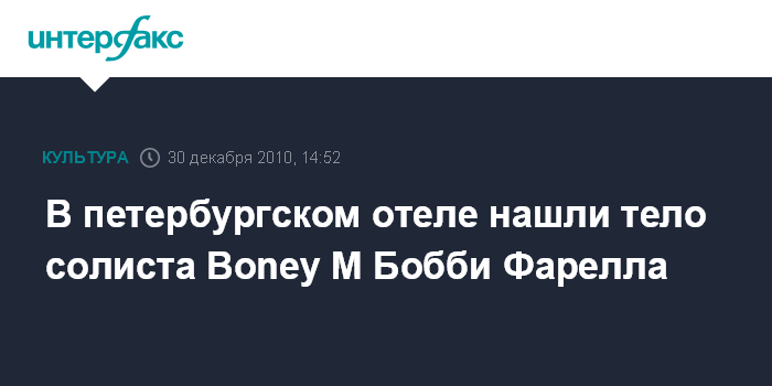 Санкт-Петербург. 30 декабря. INTERFAX.RU - В одном из отелей Петербурга в четверг утром обнаружено тело музыканта группы Boney M Бобби Фарелла.
