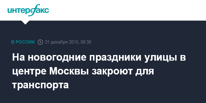 Между тем, в пресс-службе ГИБДД столицы сообщили "Интерфаксу", что будет ограничено движение транспорта с 22:00 31 декабря 2010 года до 01:30 01 января по улицам Тверская (от Триумфальной площади до Манежной площади), Моховая (от улицы Воздвиженка до Тверской улицы), Охотный ряд (от Тверской улицы до Лубянской площади) и Васильевскому спуску.