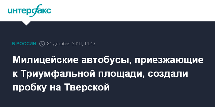 Москва. 31 декабря. INTERFAX.RU - На 1-й Тверской-Ямской улице образовалась пробка из-за большого количества автобусов и грузовиков с сотрудниками милиции, которые будут обеспечивать безопасность во время оппозиционной акции на Триумфальной площади в Москве, передает корреспондент "Интерфакса".