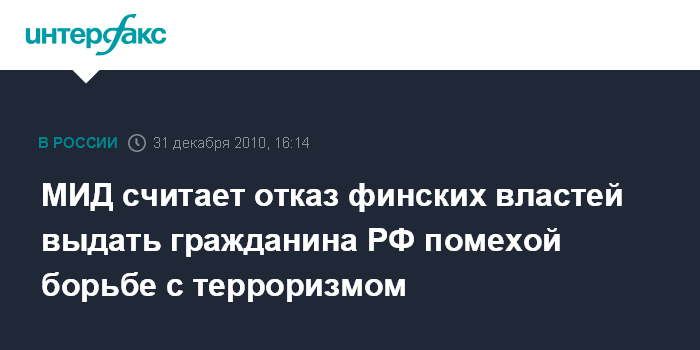 Москва. 31 декабря. INTERFAX.RU - В Москве удивлены тем, что Финляндия отказалась выдать гражданина РФ, обвиняемого в убийстве российских военнослужащих в Чечне.