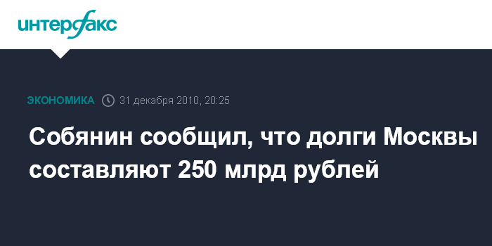 Ново-Огарево. 31 декабря. INTERFAX.RU - Москва вступает в 2011 год с 250-миллиардным рублевым долгом, сообщил мэр столицы Сергей Собянин на встрече с премьер-министром Владимиром Путиным в пятницу.