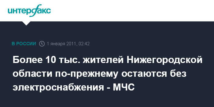 Нижний Новгород. 1 января. ИНТЕРФАКС-ПОВОЛЖЬЕ - В Нижегородской области в новогоднюю ночь остаются без электроснабжения 10 тыс. 505 жителей, в том числе 35 детей, в 4 районах.