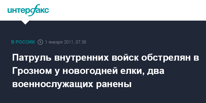 Москва. 1 января. ИНТЕРФАКС - Двое военнослужащих-контрактников внутренних войск МВД РФ ранены неизвестными в Грозном при патрулировании площади, где установлена новогодняя елка, сообщили агентству "Интерфакс-Юг" в субботу в штабе временной группировки войск.