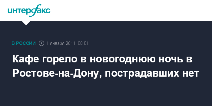 Ростов-на-Дону. 1 января. ИНТЕРФАКС - Возгорание в кафе ликвидировано в новогоднюю ночь в Ростове-на-Дону, сообщили агентству "Интерфакс-Юг" в правоохранительных органах города.