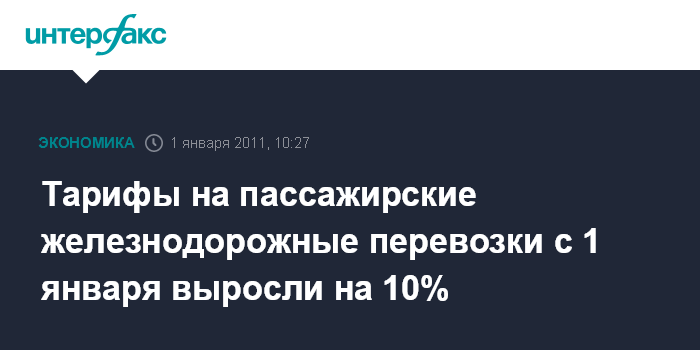 Москва. 1 января. INTERFAX.RU - Тарифы на пассажирские железнодорожные перевозки с 1 января 2011 г. выросли на 10%, такое решение было принято на заседании правления Федеральной службы по тарифам (ФСТ) в декабре 2010 г. Данный темп роста тарифов был одобрен правительством РФ в прогнозе социально-экономического развития РФ на 2011-2013 гг.