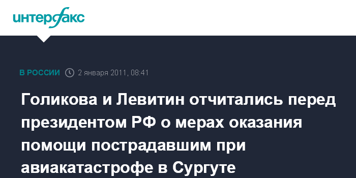 Как сообщили в пресс-службе президента РФ, Т.Голикова и И.Левитин "доложили Д.Медведеву о мерах, предпринимаемых для оказания всей возможной помощи пострадавшим и родственникам погибших в результате авиакатастрофы в Сургуте".