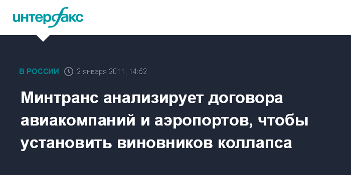 Москва. 2 января. INTERFAX.RU - Министерство транспорта РФ проводит анализ договоров о сотрудничестве между московскими аэропортами и авиакомпаниями с целью установления виновных в произошедшем 26 и 27 декабря авиационном коллапсе, заявил журналистам министр транспорта Игорь Левитин после оперативного совещания в воскресенье. "Мы проверяем договоры "Домодедово" с энергообеспечивающими компаниями, чтобы установить, чья была ответственность в произошедшем отключении. Либо это форс-мажор, либо кто-то не исполняет свои обязанности", - сказал он.