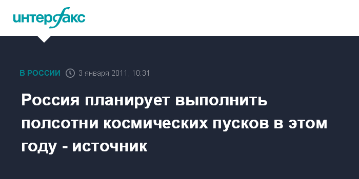 Москва. 3 января. INTERFAX.RU - Россия может осуществить в 2011 году около 50 пусков ракет космического назначения с трех космодромов, сообщили "Интерфаксу-АВН" в ракетно-космической отрасли. "Более 35 космических пусков намечается провести с космодрома Байконур, арендуемого Россией у Казахстана, около десяти пусков - с космодрома Плесецк в Архангельской области и четыре пуска - из позиционного района Домбаровской ракетной дивизии РВСН в Оренбургской области", - сказал собеседник агентства.