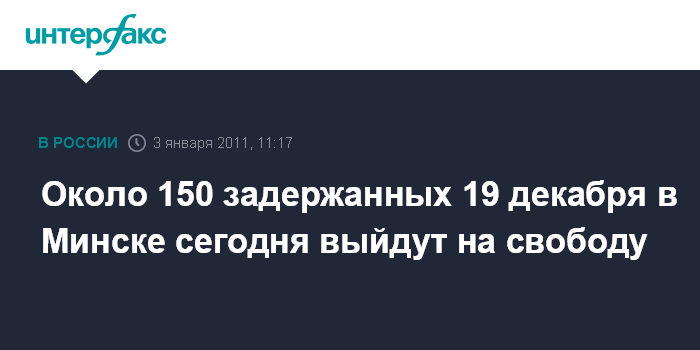 Минск. 3 января. INTERFAX.RU - Около 150 участников несанкционированной акции оппозиции в Минске после президентских выборов 19 декабря в понедельник должны освободиться из спецучреждений. "Сегодня заканчиваются 15 суток административного ареста примерно у 150 человек, которые были задержаны во время несанкционированной акции оппозиции в Минске 19 декабря", - сообщил агентству "Интерфакс-Запад" источник в правоохранительных органах.