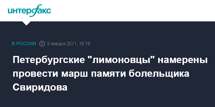 Санкт-Петербург. 3 января. INTERFAX.RU - Петербургское отделение "Другой России" совместно с региональным движением против нелегальной миграции (ДПНИ) собираются провести марш в память о болельщике Егоре Свиридове в центре Петербурга, сообщили "Интерфаксу" один из лидеров регионального отделения "Другой России" Андрей Песоцкий. "31 декабря мы подали заявку на проведение нашего шествия в Смольный, будем надеяться, что власти согласуют нам наш митинг", - сказал он. По словам собеседника агентства, акция намечена на 15 января - 40-ой день смерти Е.Свиридова.