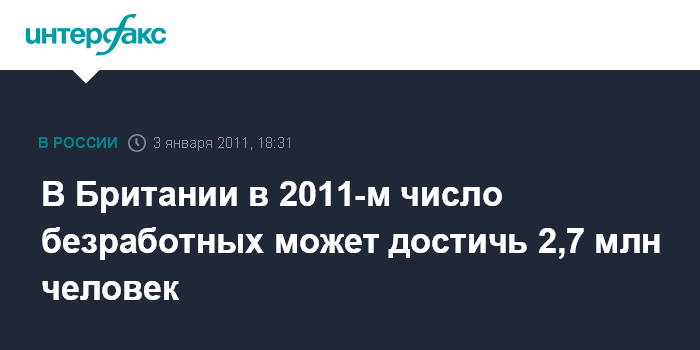 Лондон. 3 января. INTERFAX.RU - Количество безработных в Великобритании в 2011 году может достигнуть наивысшей отметки за последние 17 лет - 2,7 млн человек, говорится в сообщении лондонского Института специалистов по подбору кадров (CIPD). До 9% трудоспособных граждан страны останутся без работы в следующем году, что на 1,1 процентного пункта больше, чем в минувшем году, приводит прогноз экспертов телерадиовещательная корпорация BBC. В декабре 2010 года число безработных в Великобритании составляло 2,45 млн человек.