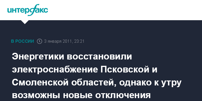 Москва. 3 января. ИНТЕРФАКС - Сотрудники ОАО "Холдинг МРСК" полностью восстановили энергоснабжение потребителей Псковской и Смоленской областей, сообщили "Интерфаксу" в пресс-службе холдинга.
