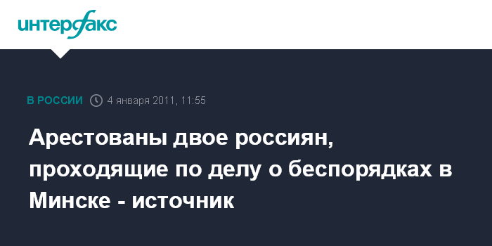 Минск. 4 января. INTERFAX.RU - Следствие приняло решение о заключении под стражу двух россиян, которые были задержаны по уголовному делу о массовых беспорядках в Минске. "Они арестованы, к ним применена мера пресечения в виде заключения под стражу. Об этом проинформированы представители российской дипмиссии в Минске", - сообщил агентству "Интерфакс-Запад" во вторник высокопоставленный источник в правоохранительных органах Белоруссии.