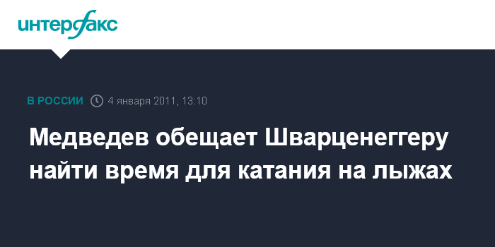 Москва. 4 января. INTERFAX.RU - Президент России Дмитрий Медведев принял приглашение экс-губернатора Калифорнии Арнольда Шварценеггера вместе покататься на лыжах. "Спасибо. Мы договаривались, я помню. Мы, несомненно, найдем время", - написал президент в своем англоязычном блоге @MedvedevRussiaE в "Твиттере" во вторник.