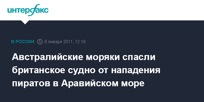 Сидней. 6 января. INTERFAX.RU - Корабль австралийских ВМС "Мельбурн" отбил атаку пиратов на британское судно с грузом химикатов в Аравийском море, сообщает в четверг министерство обороны Австралии.