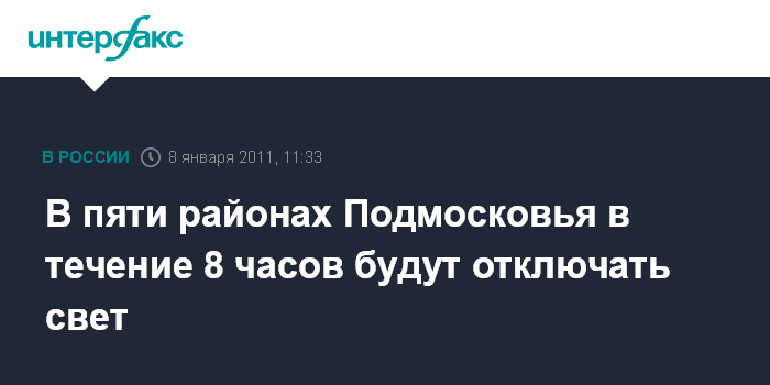 Москва. 8 января. INTERFAX.RU - МЧС России предупредило жителей пяти районов Подмосковья о плановых отключениях электроэнергии. "С 10 до 18:00 в Одинцовском, Истринском, Рузском, Подольском и Домодедовском районах Московской области будут проводиться плановые отключения электроэнергии", - говорится в сообщении пресс-службы Центрального регионального центра МЧС России, поступившем в субботу в "Интерфакс".