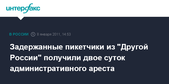 Москва. 8 января. INTERFAX.RU - Суд в Москве приговорил к двум суткам административного ареста активистов незарегистрированной партии "Другая Россия", которые провели несанкционированную акцию на Красной площади. Представитель "Другой России" Александр Аверин сообщил "Интерфаксу" в субботу, что дела в отношении Марата Салахиева и Дмитрия Андриянова рассмотрел мировой суд Тверского района Москвы.