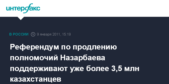 Семей. 9 января. INTERFAX.RU - В поддержку проведения референдума по продлению полномочий действующего президента Казахстана Нурсултана Назарбаева собрано 3,6 млн подписей. "Собрано уже 3 млн 600 тысяч подписей в поддержку референдума по продлению президентских полномочий Нурсултана Назарбаева до 2020 года", - сообщил в воскресенье агентству "Интерфакс-Казахстан" председатель инициативной группы по проведению референдума Ерлан Сыдыков.По его словам, казахстанцы очень активны и настроены на проведение референдума.