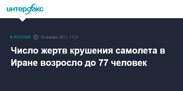 Тегеран. 10 января. INTERFAX.RU - Крушение пассажирского самолета на северо-западе Ирана, по последним данным, привело к гибели минимум 77 человек, еще 26 ранены, сообщает местное агентство ИСНА. Ранее сообщалось о 70 погибших в результате крушения самолета "Боинг-727", принадлежащего компании "Иран Эйр". По данным местных властей, на борту разбившегося самолета находились 105 человек: 94 пассажира и 11 членов экипажа.
