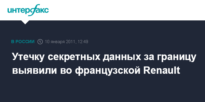Париж. 10 января. INTERFAX.RU - Руководители французского автоконцерна Renault получили данные, указывающие на то, что копии некоторых секретных документов компании тайно передавались за границу, пишет в понедельник местное финансовое издание "Эко". По данным "Эко", руководство Renault еще в августе 2010 года было проинформировано о происходящих утечках информации. "Похоже, что речь идет о случае промышленного шпионажа. За информацию кто-то платил деньги", - пишет газета.
