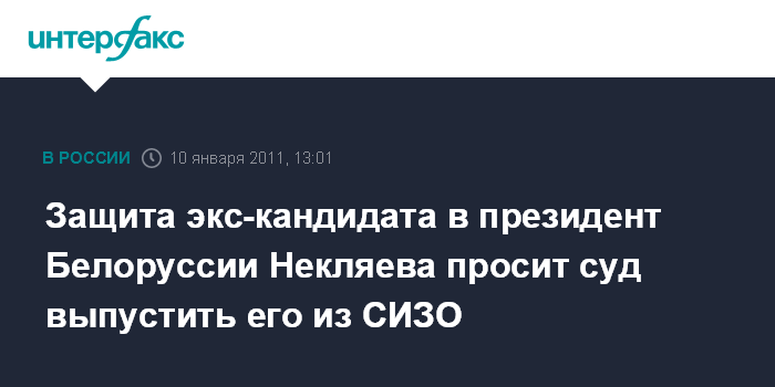 Минск. 10 января. INTERFAX.RU - Адвокат экс-кандидата в президенты Белоруссии Владимира Некляева направил жалобу в Минский городской суд, в которой просит отпустить его подзащитного из-под стражи. "Мы направили в Минский горсуд жалобу на решение суда Центрального района, который отказался изменить В.Некляеву меру пресечения", - сообщил агентству "Интерфакс-Запад" в понедельник адвокат В.Некляева Владимир Букштынов. "Рассмотрение жалобы в суде, скорее всего, будет назначено в ближайшие среду-четверг", - сказал адвокат.