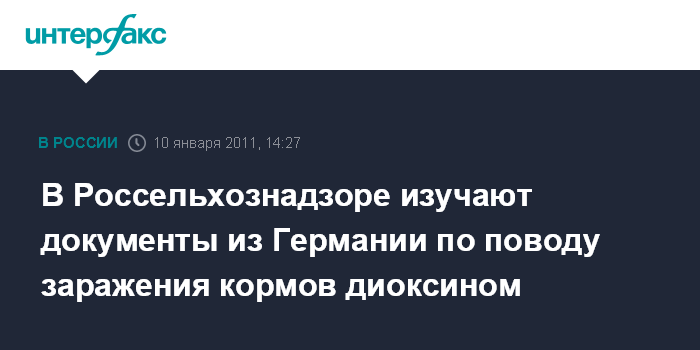 Москва. 10 декабря. INTERFAX.RU - Россельхознадзор получил в понедельник официальный ответ от министерства продовольствия, сельского хозяйства и защиты прав потребителей Германии на запрос о состоянии дел в связи с крупномасштабным загрязнением кормов диоксином и приступил к изучению представленных материалов.