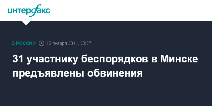 "Следственным управлением предварительного расследования ГУВД Мингорисполкома установлены личности свыше 120 человек, активно участвовавших в массовых беспорядках 19 декабря 2010 года на площади Независимости, 31 из которых предъявлено обвинение", - сообщили агентству "Интерфакс-Запад" в понедельник в ГУВД Минска.