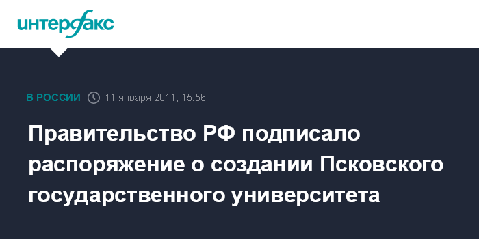 Псков. 11 января. INTERFAX.RU - Распоряжение о создании Псковского государственного университета подписано правительством РФ, сообщает во вторник пресс-служба администрации региона.