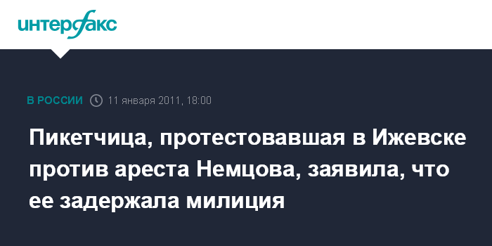 Ижевск. 11 января. ИНТЕРФАКС-ПОВОЛЖЬЕ - В Ижевске во вторник одиночный пикет против ареста Бориса Немцова и других активистов оппозиции после получаса проведения закончился задержанием пикетчицы и двух журналистов, сообщила агентству "Интерфакс-Поволжье" по телефону Софья Русова, проводившая эту акцию.